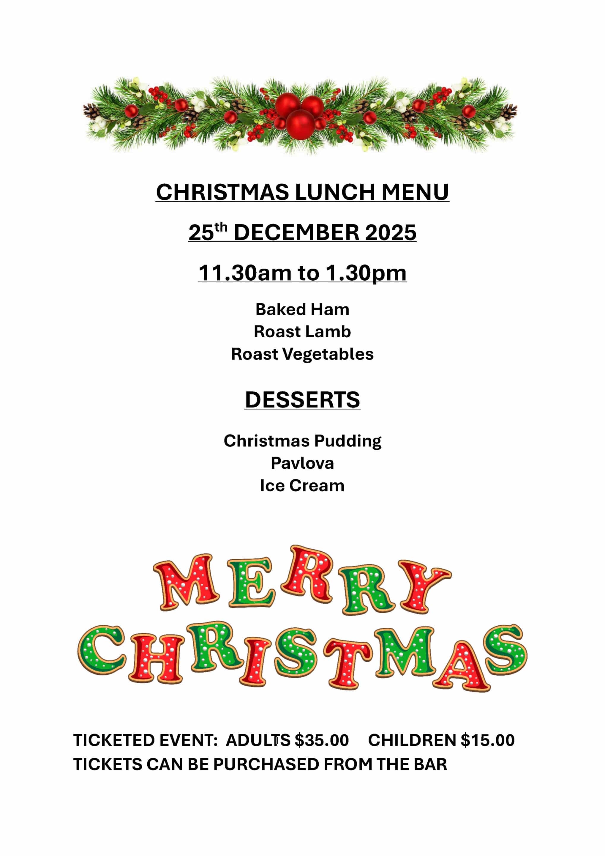 NOTE: Due to strict licensing conditions, the club will only be open on Christmas Day to people that have pre-purchased a meal ticket. Alcohol will only be served half an hour before the meal and up to half an hour after you have finished eating. The gaming room will not be open